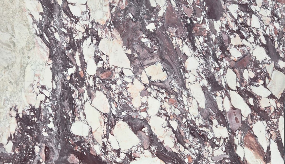 A striking and sophisticated surface featuring a crisp white background dramatically contrasted by rich, flowing veining in deep burgundy, wine, and soft gray tones. Its bold, organic pattern creates a luxurious visual impact, making each slab uniquely expressive.